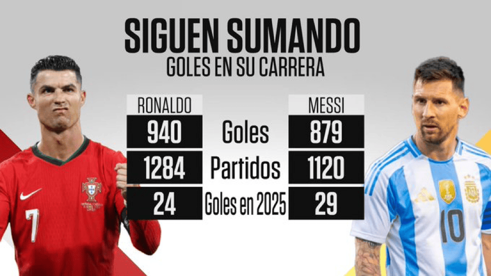 ESPN对比了C罗和梅西职业生涯目前的总进球数,C罗目前在1284场比赛里共打进940球,梅西则在1120场比赛里收获879球。在2025年,C罗目前的进球数为24球,梅西则为29球。